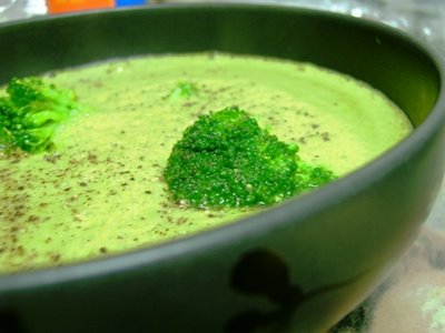 Broccoli soup with a brown rice rice cake topped with organic hummus