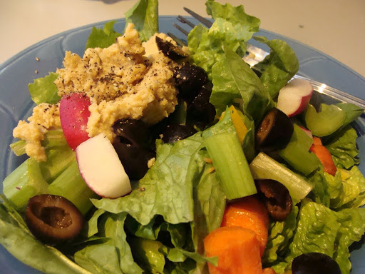 Rice pasta noodles, tomato sauce with added fresh basil, fresh parsley, garlic, salt and pepper – paired with a hummus salad. I was so full I couldn’t eat all of my salad!