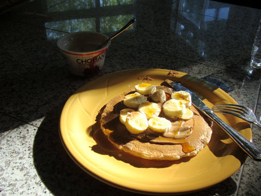 I usually don’t stray away from my Green Monsters in the morning but Marc had wanted pancakes so I opted to have one, too. Topped with almond butter, maple syrup, a ripe banana and a cup of Greek yogurt – it was very tasty and a nice change!