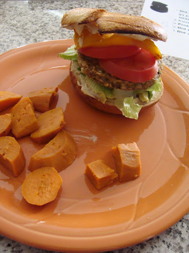 This beauty was a tasted bagel, hummus, tomato, lettuce, roasted yellow bell pepper and a Gardenburger. Served up with a side of steamed sweet potato. It was messy, big but VERY good!