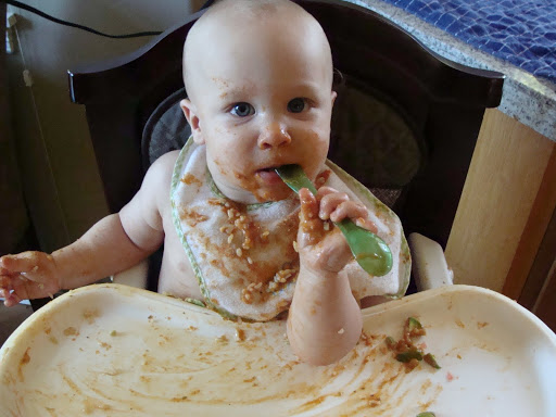 Oh and just look at this messy eater! I made him organic brown rice mixed with organic pasta sauce and avocado. All he was impressed with was the spoon 🙂