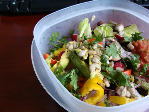Romaine hearts, bell pepper, cilantro, avocado, sunflower seeds, salsa, red onion, radishes, salt and pepper and a tad of olive oil. I also had some blue corn chips for crunch.