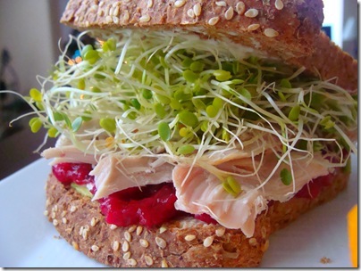 It had avocado, light mayo, sprouts, cranberry sauce and turkey between two slices of toasted, sprouted bread. The best! – from this post in 2009
